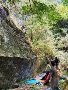 先月末、ジムのお客さんとバイトの T 川君と外岩ツアーに行ってきました!場所は川井駅からバスでアプローチする大丹波ボルダー。ジムの外岩ツアーで行くのは2回目で、お気に入りの岩場の一つです。