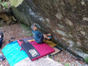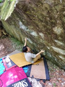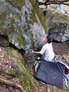 さて、お客さんがセッションしている間、私はその右側の面がなんとなく気になっていました。一面、オール苔なのですが、苔の上からでも使えそうなホールドがわかる!ので、お客さんのトライを写真撮影しつつ、掃除を開始。