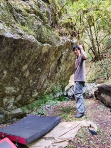 この岩は今から4年前の2021年の8月に見つけた岩で、他の多くの岩が濡れてるなか、比較的乾いていたので掃除して(おそらく)初登した課題があります。4級くらいかな?高グレードの課題がひしめく大丹波で、このグレードの課題はけっこう貴重にも思えるのですが、別に発表するほどでもないよなぁ、、、と思いつつも、大丹波を訪れるたびにリピート&未登の SD にトライしていたのでした。