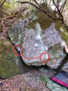 さて、その後は「声」のある岩のエリアへ移動。日登トポだと上部エリアの「広場」と書かれているところを川側へ降りて、川を渡ると大きな声岩があり、その右にある小さい岩が目的地。