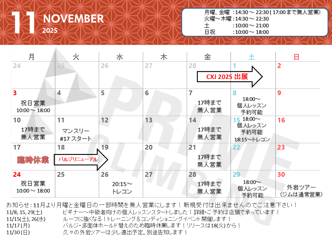 関連情報 キッズコンペ開催のお知らせ! 2026/01/23 2026年1月の営業カレンダーです! 2025/12/30 12月の営業カレンダー、公開します! 2025/12/01 バルジ~多面ホールドリニューアルしました! 2025/11/29 臨時休業のお知らせ! 2025/11/16 11月のトレーニング・コンディショニングイベントのお知らせ! 2025/11/14