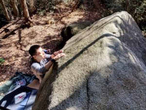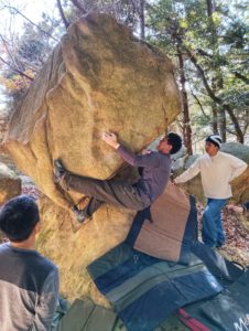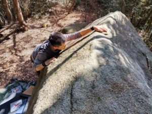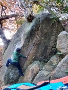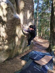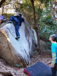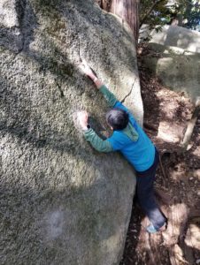 その後はかぶった2級にトライ。トゥフックを決めて右手をバーン!と出す、笠間には珍しいわりとジムナスティックな課題です。けっこう惜しいトライが続きましたが、まだ午前中だし出し切るとマズいので次回!ということでエリアを移動します。この岩は私は初めて触ったのですが、どれも短いながら内容が濃く、思いのほか良い課題だらけでした。