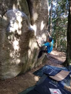 ベンチ岩の8級課題。わりと顕著なエッジをマッチして、足を上げてリップを取る課題ですが、私はデッドでダイナミックにリップを叩くムーブで解決。体感2級くらいのパワーを使ったかな、、、