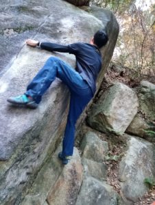 この後はメインその2のギル岩へ行こうと思っていたのですが、難しい課題が続くのもよろしくないので、計画変更してヒップ岩に。登りやすいトラバース4級をこなした後、フィストクラック6級にチャレンジ!